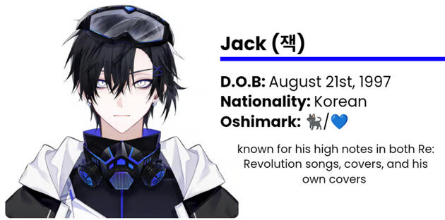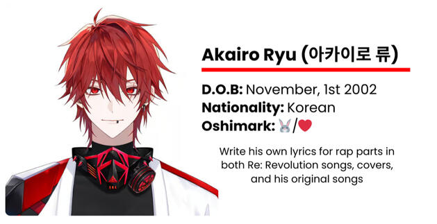 RE: REVOLUTION formerly known as Revolution Heart is a virtual boy group that currently consists of: Jack, Onyu, Gemini, and Ryu. The group debuted on July 8th, 2021 under CharonUniverse with single "등장 (appearance)". They redebuted as RE:REVOLUTION with new member Leeon on April 26th, 2024 with single "Reload" after terminated their contract with CharonUniverse on December 22th 2023.
